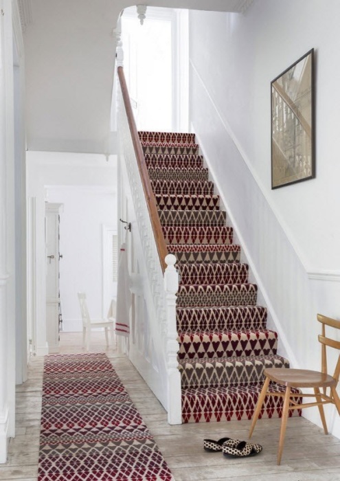 Полусинтетический ковёр с коротким ворсом - отличное решения для светлого пространства возле лестницы.