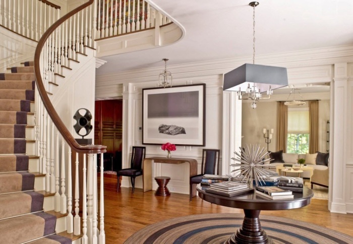 Традиционная ковровая дорожка - идеальное решение для небольшой прихожей в светлых тонах.
